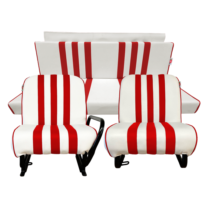 LOT GARNITURES (2 SIÈGES AV + BANQ AR) SKAÏ BLANC RAYÉ ROUGE MEHARI